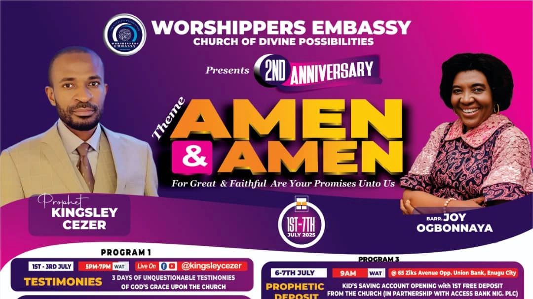 WORSHIPPERS EMBASSY is a prophetic church & a flaming prayer altar raised by the Most High in line with the witness of the Angel of the LORD Who appeared to His anointed (Kingsley Cezer) twice in three and half years (2018 & 2022) commanding him to "Go and Preach the Gospel according to Matthew 19:26" FOR WITH GOD ALL THINGS ARE POSSIBLE. Aslo 10year earlier (in 2013) the Voice of the LORD had come to him audibly saying "WEST AND EAST SHALL WORSHIP ME". Hence as the incorporated name implies "Worshippers Embassy Church of Divine Possibilities" soars on the wings of the prophetic and the Spirit of true worship which produce the miraculous with uncommon testimonies of salvation, deliverance, financial abundadance, health and wholeness. Join / Partner with us in faith and experience the wonders of the God of all Possibilities!